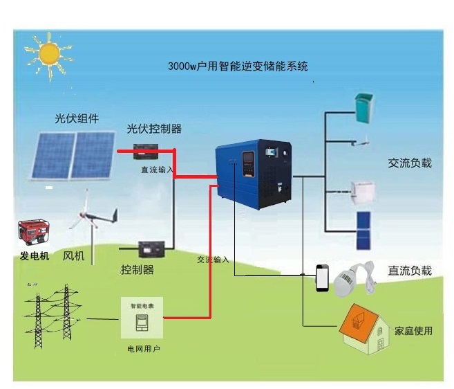 產品以光伏發電應用為主題,可以同時使用儲能電以及市電或其它放電設備的電力。
